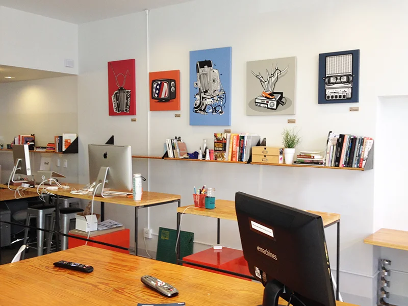 Illustrated works by Jupiter Visual now hanging at the new Atomic20 co-working space in Boulder at 2088 Broadway.